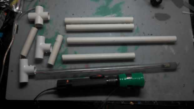 1, longitud de 16 pulgadas para el tubo de lanzamiento. Estoy usando PVC transparente calibre 40 (web buscar "soluciones de flujo de Ryan Herco claro del pvc" para encontrar una fuente local de pvc transparente. Pvc claro es costoso sin embargo agrega un alto factor cool).