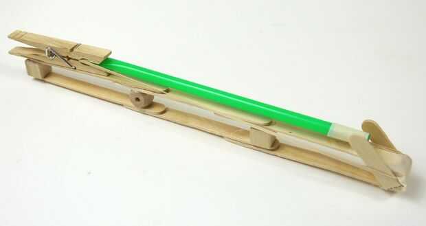 Un lanzador de flecha Dispara proyectiles que son idénticos a éstos. El ejemplo básico tiene una modificación: un par de palillos de pequeña guía pegados en el frente del lanzador. Esto aumenta la fiabilidad y exactitud.