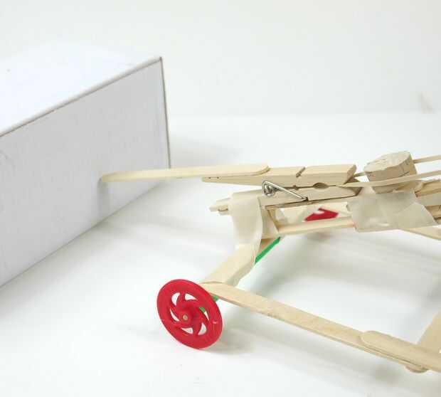 El Vehículo lanzador de corcho es mucho más que un lanzador de corcho sobre ruedas. Un palillo de arte pegado al extremo de la pinza para la ropa actúa como un disparador. Cuando el coche esté colocado en una pared, el palillo de arte aprovecha la fuerza del impacto al abrir la pinza para la ropa, que automáticamente el launcher el corcho. Tener cuidado! Sitúate siempre al lado del camino del coche. Nunca coloque usted mismo directamente en la trayectoria del lanzador. Esto es esay a olvidar ya que es muy intuitivo para empujar el coche directamente de uno mismo. Siempre Manténgase a un lado.