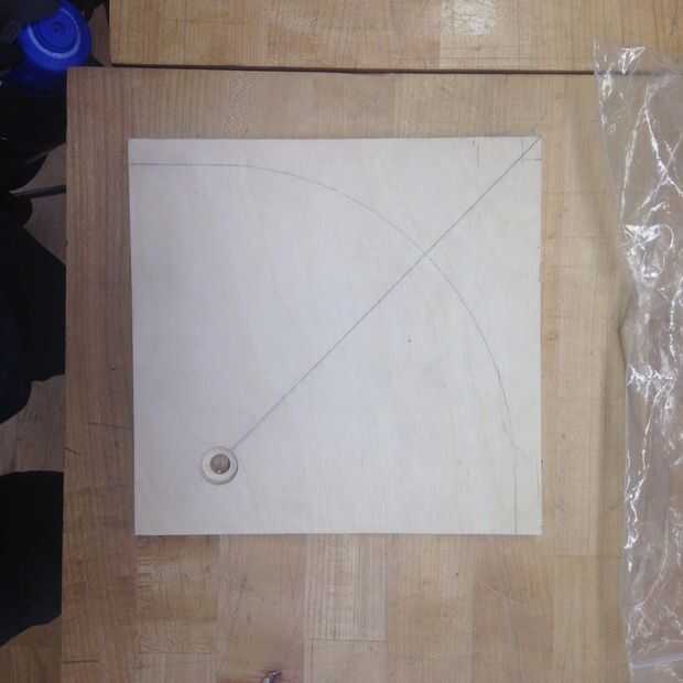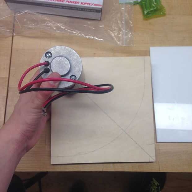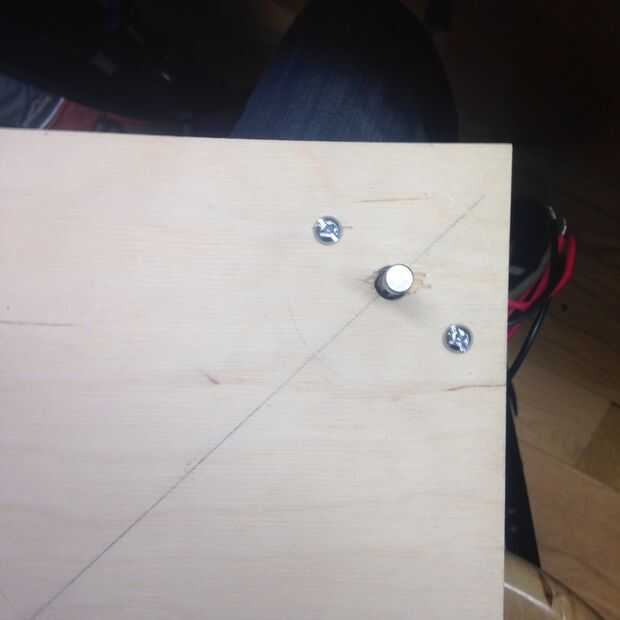 Los agujeros del motor irá en la cara superior. Para perforar los agujeros para el motor, comienza con el agujero central. Perfore un agujero ligeramente más grande que el diámetro del eje para evitar el frotamiento de los materiales. Entonces, perfore agujeros a la distancia apropiada del eje para alinear con los agujeros para los tornillos de #8.