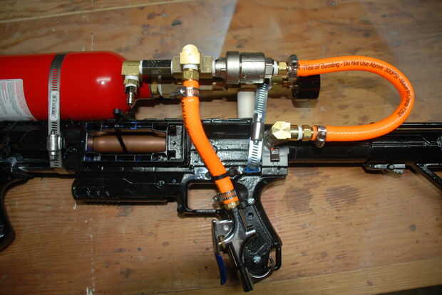 Tornillo en el extremo de la pistola de soplado Asamblea y usando los amarres de tornillo, seguro la pistola a la empuñadura de la pistola.  Puede que necesite cortar la manguera para ser la longitud correcta.