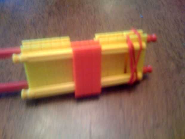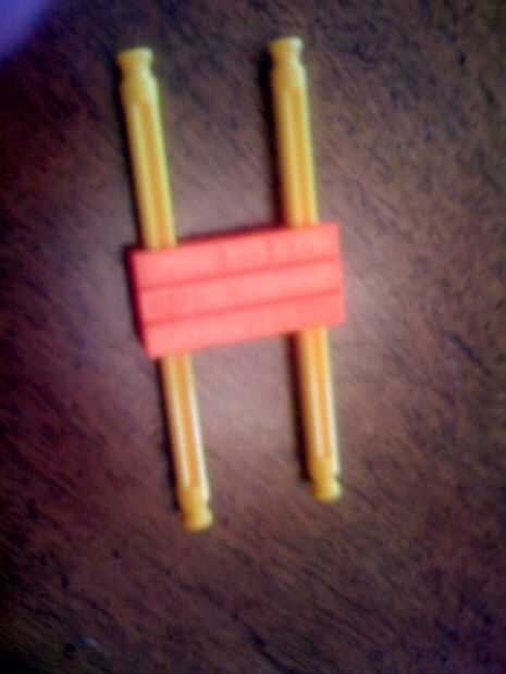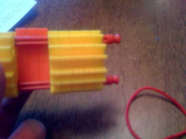 Instale tres conectores naranja a dos barras amarillo como se muestra en las imágenes. Y conectarlas con la pequeña banda de goma delantera cinco piezas de conectores amarillo como se muestra.