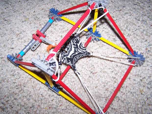 Un lanzador muy potente. Dispara con la barra gris que está conectada a la pieza naranja. Tira más fuerte cuando hay cuatro gomas en.