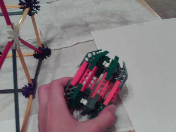 esta es mi bomba doble KVG. es potente y fácil de hacer.conteo de piezas:dos pernos de barras amarillos4 conectores naranjados barras verdes12 separadores gris4 pequeñas bandas de cauchoy eso es una bomba doble de KVG!