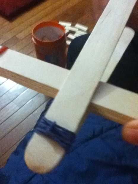 Obtener dos popcicle palos encima de la otra y sólo conectar en un extremo con una banda elástica y pegarlo a la barra de