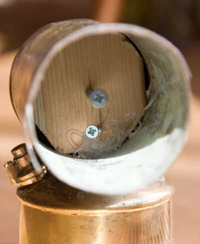 Al final corté un cilindro rugoso de madera tan grande como el interior del tubo, perforó un agujero en el también tan grande como la cabeza del quemador, entonces lo montó. Con mucha suerte he insertado un tornillo en la madera que bloquean la cabeza en la madera. Había un pequeño agujero en la cabeza que estaba buscando pero echaba de menos, pero parece que han bloqueado el tubo muy bien sobre el quemador!