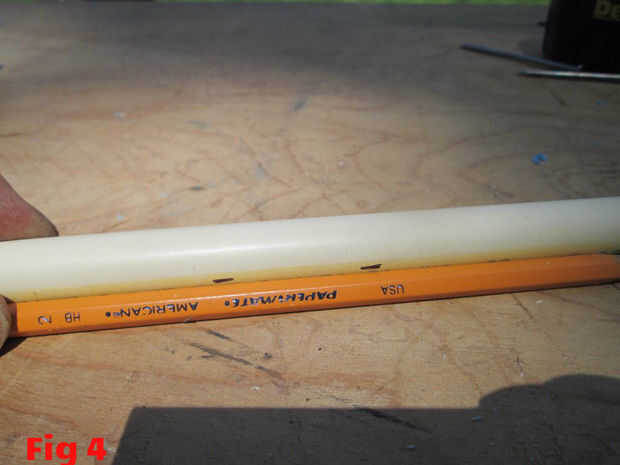 Pone el tubo en una superficie plana y la línea de las marcas que hizo, utilizando un lápiz como una regla. Dibujar una línea de 2" conexión de estas marcas. (Fig 4 y 5) Ahora tiene dos líneas en el tubo CPVC directamente frente a la unos a otros.