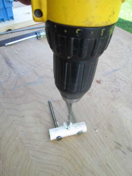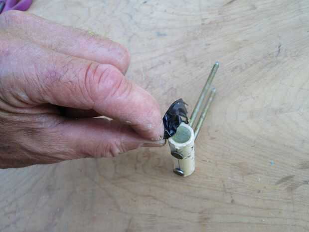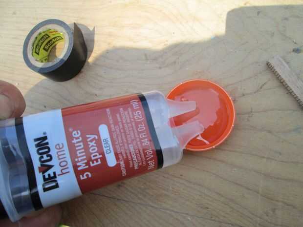 Mezclar suficiente epoxi de 5 minutos para llenar al conjunto de yugo. Tienes que trabajar con rapidez y no se olvide de mezclar lo suficiente! Vierta el epoxi en el extremo abierto del tubo. Puede que necesite tomar un alambre para meter en la mezcla de epoxi para asegurarse de que no hay enormes burbujas atrapadas. Cuando el epóxico está seco, retire la cinta. Luego vuelva a perforar el orificio de 3/16 en el centro del tubo.