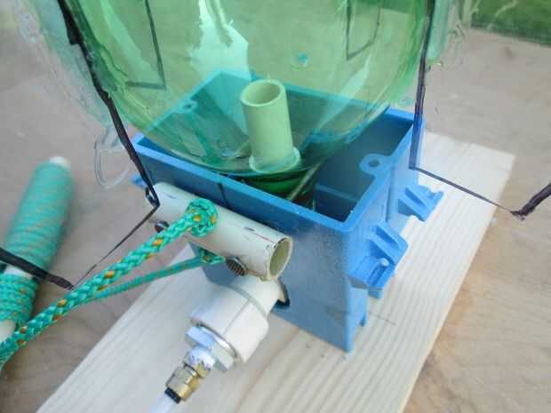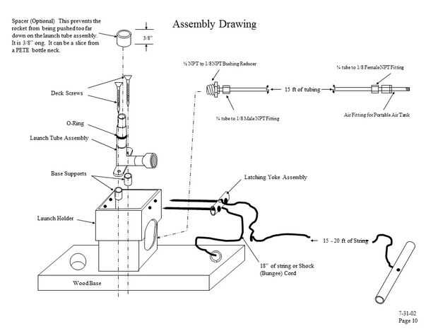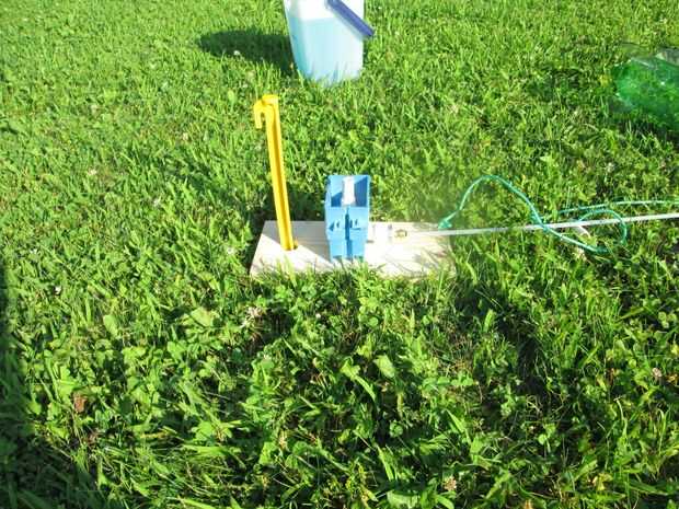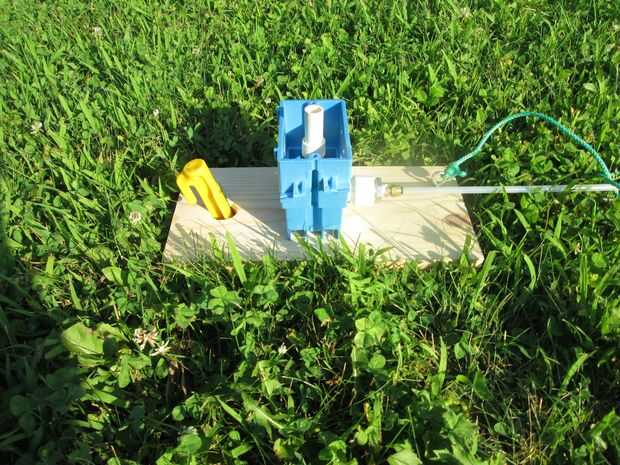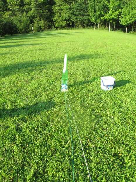 Para utilizar el launcher, conducir una estaca de la tienda a través del orificio de 1 1/8". Esto asegura el lanzador cuando se tira el yugo. Usted tendrá que poner un poco de agua extra en el cohete de agua porque usted va a perder un poco al invertir el cohete para colocar en el lanzador. Llenar el cohete de 1/2 lleno de agua. Deslice la botella cohete sobre la junta tórica y bloquearlo con el yugo. Asegúrese de no tirar la cadena antes de presión en el cohete! El yugo sale muy fácilmente hasta que haya un poco de presión. Por lo general dejar la holgura de la cadena y no levante la manija de lanzamiento hasta que no haya presión en el cohete. Siempre tiene una cuenta regresiva y tire la cadena de una empresa.