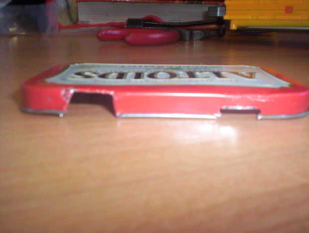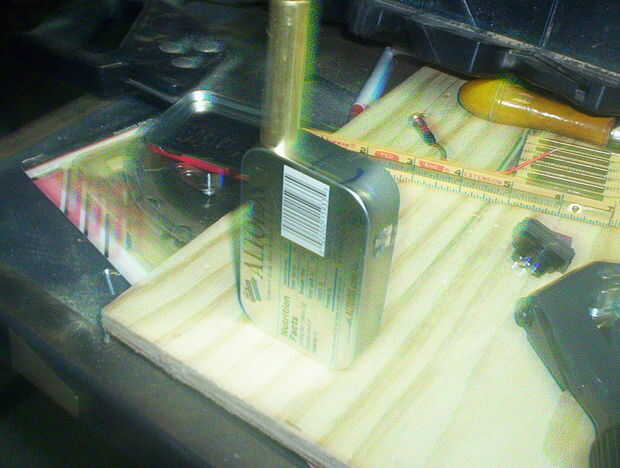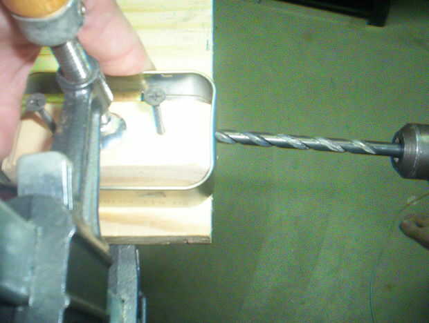 Piezas y herramientas: Lata Altoids, alicates, tijeras podadoras Metal, taladro, grandes brocas para taladro, una broca pequeña, Ronda bloque de madera del archivo, abrazadera,