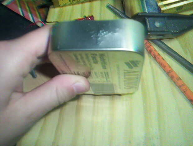 Paso 1: Doblar las lengüetas de metal que sostiene la tapa en la parte posterior. Retire la tapa. Doblar una pestaña por lo que no es ningún agujero en la lata. Luego doblar una pestaña quede plana contra la lata. (Foto 1)