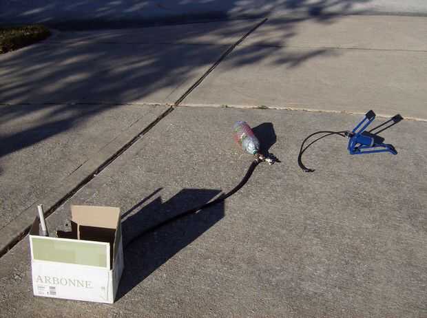 Mi hijo de 9 años de edad construyó este lanzador del cohete del aire usando una botella de plástico de 2 basura, piezas de sistema de riego y una Asamblea de control remoto de un aerodeslizador viejo. Comenzó un par de años atrás como una bellota arma accionado por una bomba de aire de pie y evolucionado a este lanzador de control remoto. Mi única aportación fue que lo lleve a la tienda para comprar piezas y presentar esto para él. No sé los nombres exactos de las piezas o el tamaño exacto pero le haremos nuestro mejor para describirlos.