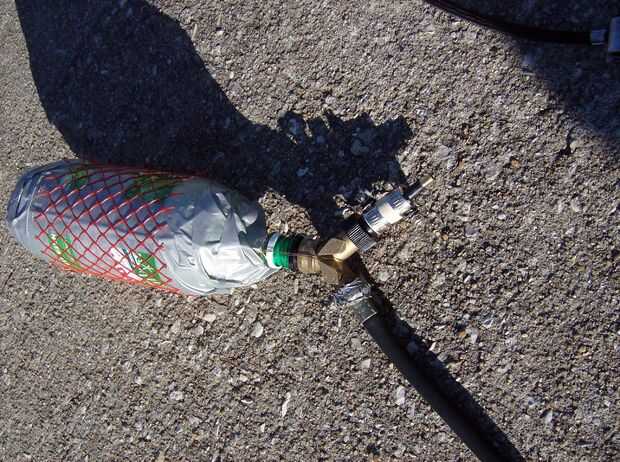 Tornillos de montaje de la válvula en la Y del neumático. Al final de la Y que va en la botella tiene un macho atornillado rápido en eso. Del lado masculino, 5" pedazo de manguera de caucho se presiona firmemente todo el camino en. La manguera es luego empujado dentro de la botella. Su bastante apretado, pero al hacer el alambre del seguro, se envuelve a través Y alrededor de la botella varias veces. La botella es envuelto en cinta como medida de seguridad. En el otro extremo de la Y, la manguera de la lavadora esté bien.
