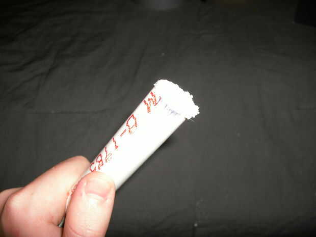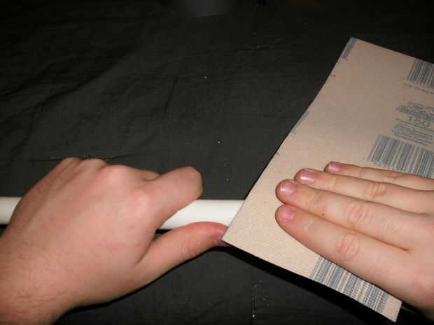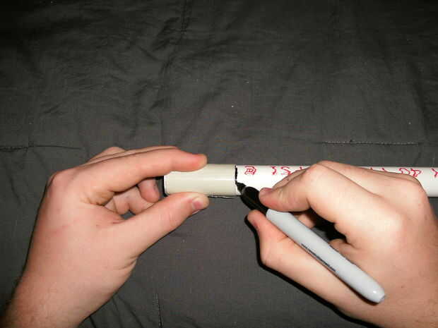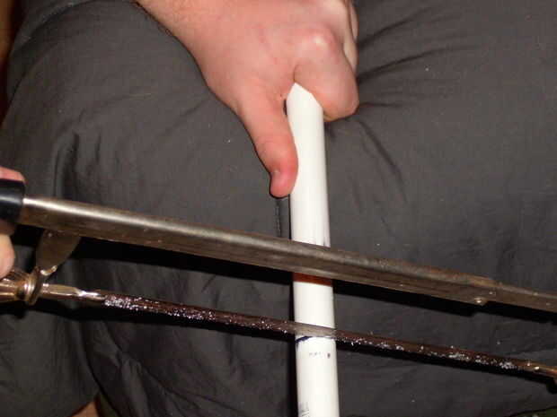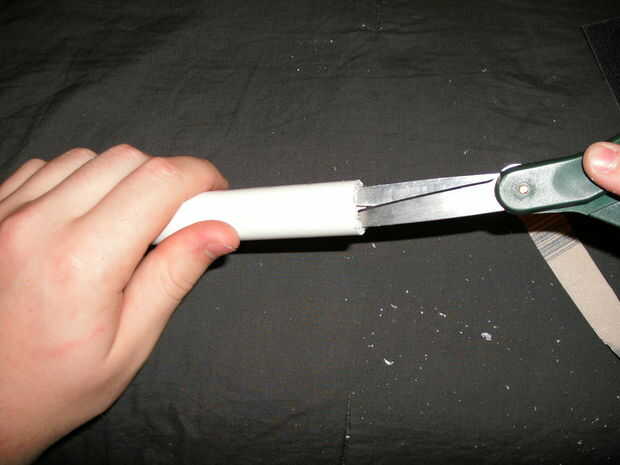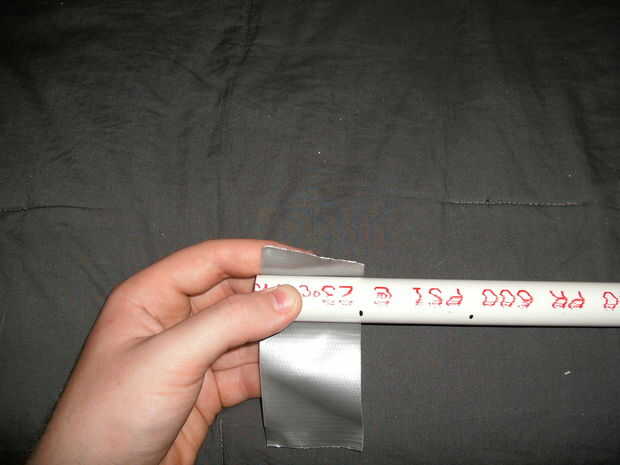 Usted quiere hacer los cortes lo más recto posible y perpendicular a la tubería. Para ello, utilicé un poco de cinta adhesiva para conductos (lado pegajoso hacia fuera) para hacer círculos de prefecto como guías de corte. No aconsejo usar que son cama para cortar en como yo lo hice. (Necesitaba un fondo uniforme de este instructable.) Pedacitos de plástico se dan en todas partes, así que hacerlo fuera o en una tienda.