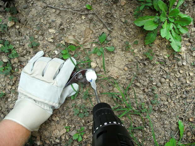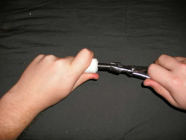 1. hacer agujero como centro muerto como sea posible en la tapa con unos alicates y preferiblemente usar algo para proteger tu mano si la perforación ocurre con resbalón. Para ello en alguna suciedad u otro lugar donde no estás preocupados por la superficie de trabajo. (No quiere un hueco en le escritorio le?)
