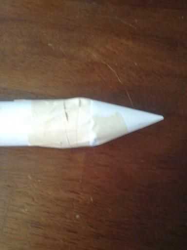 Empuje el papel hacia arriba por lo que es sobre el borde del PVC de una pulgada. Este doble y cinta adhesiva. A continuación cortar un 8.5 por 2 pulgadas pedazo de papel. Habrá extra. Rap el rectángulo en forma de cono de nariz que gustaría. Corte el exceso de papel hasta hacer un cono. Ahora, esta cinta a su cohete.