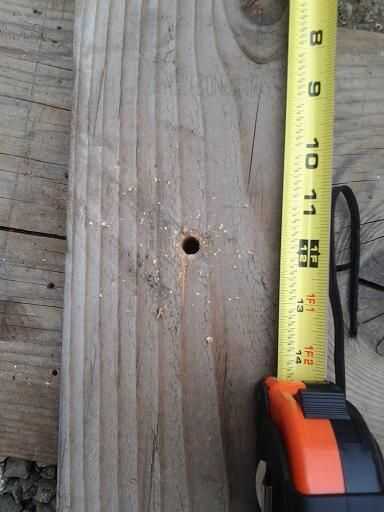 Taladre un agujero con la broca de 3/8 1 pie abajo y centrado, desde la parte superior del pie 4 de largo 2 x 6