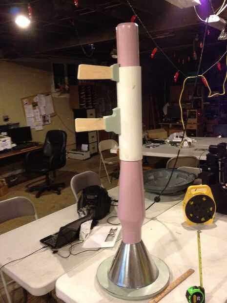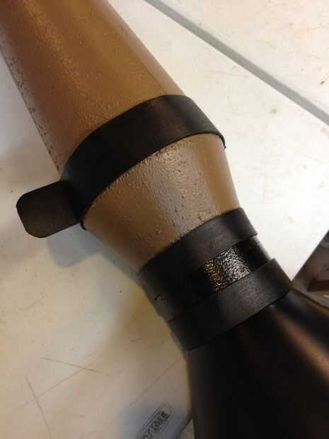Espera de la pintura se seque, Mod Poge dos 1" tiras y uno 1.5" tira de espuma negra (Asegúrese de que sean lo suficientemente largos para ir alrededor de la parte más ancha de la pieza de madera y a la derecha por encima del cono). Una vez que tenga al menos dos capas de Mod Podge, pintar con la misma pintura aerosol negra mate. Después de que secan, pegamento caliente a lo lanzacohetes con algún extra, recortar para ajustarse y encolado.