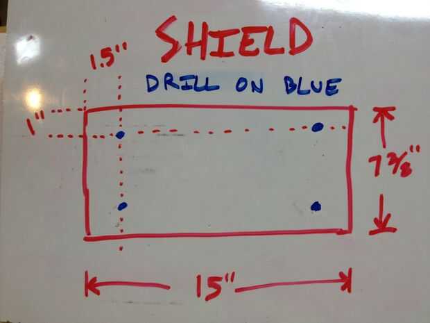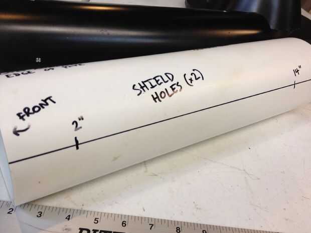 Taladre los agujeros para los soportes; un sistema es recto por encima de las manijas y la otra a 90 grados. Basta con mirar el final de la tubería y la marca final así como usted puede, a continuación, utilice la regla sobre una superficie plana para marcar una línea todo el camino. Poner marcas de Cruz de 2" y 14" y taladrar pequeños agujeros allí. Para sostener el escudo, usé algunos separadores de 1 1/8" he encontrado en el cementerio. Si usted no puede encontrar separadores usar espaciadores de nylon y algunos tornillos o pernos. No importa lo que utilizas, intentaría diseñarla para que usted puede atornillar directamente en el tubo sin tener que hacer nada en la parte trasera.