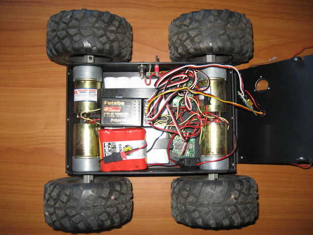 Lamentablemente, no tengo ninguna información sobre la base que utiliza, así que la foto tendrá que ser suficiente. Dentro de la cáscara del metal negro, encontrarás 4 motores de 12V - 200 rpm controlados por controladores de motor 2 con servos. En la parte superior del cuerpo hay 4 agujeros roscados para tornillos que utilizaremos para sujetar la base de nuestra plataforma.