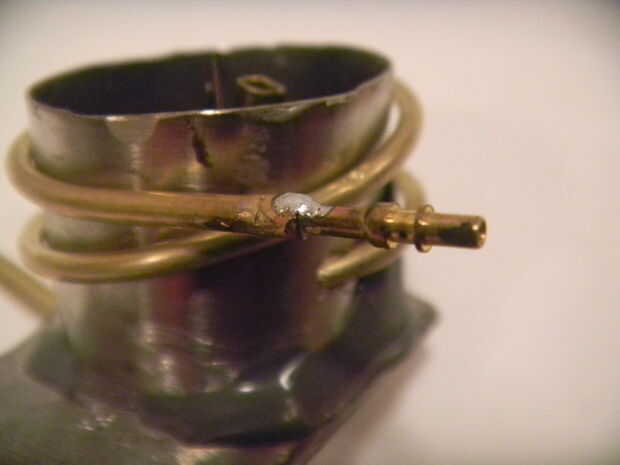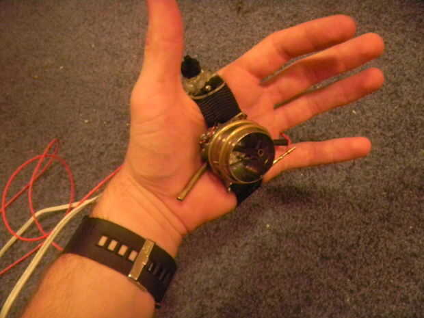 La palma: La porción de la palma fue realizada utilizando chatarra de aparatos viejos, y latón fino tubo se puede encontrar en la mayoría de las tiendas de hardware o hobby. Alambre de acero inoxidable fue utilizado como los electrodos para la ignición de la chispa. Toda la Asamblea se celebró en gran parte con JB Weld.