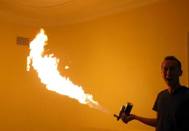 El método es igual que usando un encendedor para encender cualquier aerosol inflamable sea WD-40 o su desodorante favorito, como su pulverizando. El concepto es el mismo pero con algunas mejoras tales como usar una bombona de butano para el combustible, un chorro de cocina de la antorcha como el encendido y un tubo estrecho para el aerosol direccional, que le da una operación de mano, una llama más estrecha que a su vez viajar más y ayudarle a golpea su marca más exactamente mientras que mantener los dedos alejados de las llamas. El truco para conseguir enormes llamas es que la bombona de butano al revés mientras que rocíe. Este da aproximadamente 4 tiempo la longitud de la llama en lugar de rociar la lata mientras arriba-derecha.