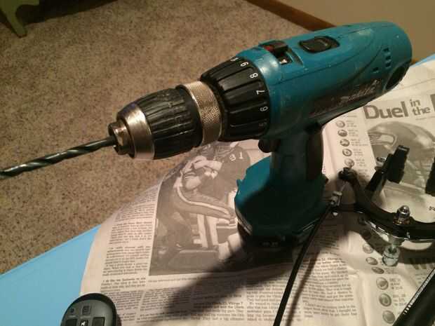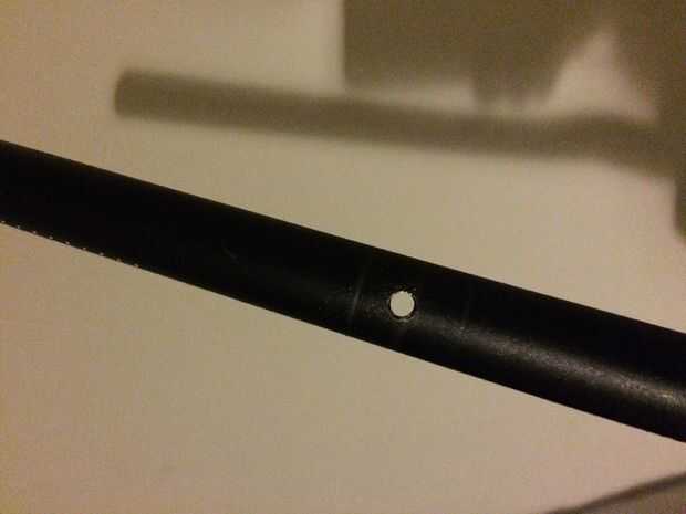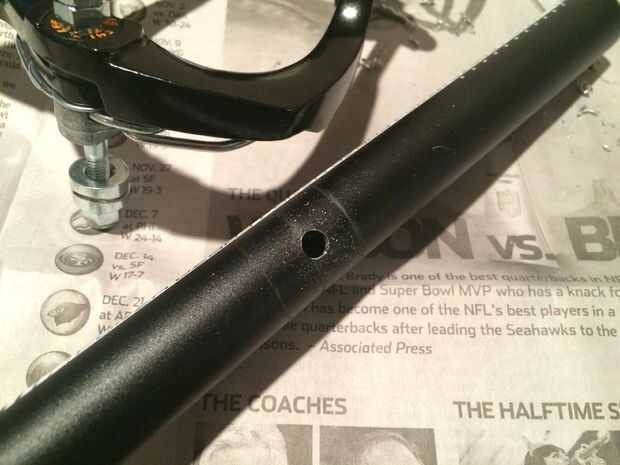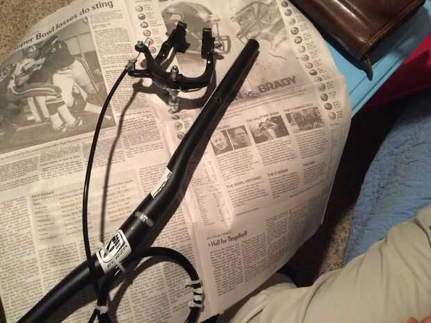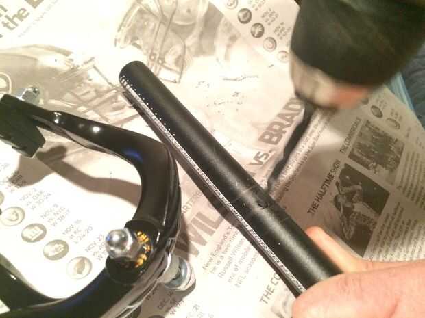 Poner un agujero en el lugar donde desea los frenos. Pongo mis sobre donde estarían los otros frenos de mano. Tenga en cuenta que los frenos de montar el asa de la barra hacia los lados, así que no lo ponga demasiado hasta el final.