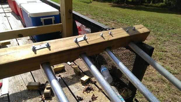 Después de hacer muescas en el 4 x 4 con 1 1/2" de ancho y 1 5/8" profundas muescas para el conducto y los pernos en U para ser empotrado debajo de la superficie de la madera, instalamos el conducto y aseguradas con pernos en U. Es importante destacar que lo hizo ligeramente doblamos el primera 6" del conducto a sobre un ángulo de 15 grados para ayudar a Lisa la transición y mantener el nivel de 4 x 4.