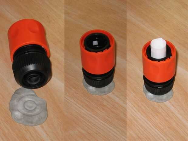 Poner un pedazo de Blu-Tack, plastilina o plastilina en la mesa de trabajo y soporte el conector Gardena en su extremo (collar naranja apuntando hacia arriba) para que el Blu-Tack bloquea el orificio central. Puede que desee hacer un cilindro protector de un pedazo de papel para que no te pegamento en el interior las paredes cerca de la parte superior del acoplamiento.