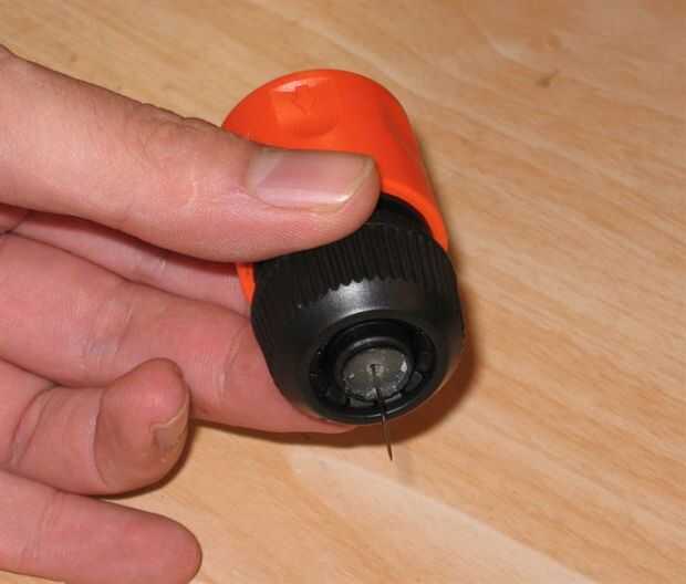 Inserte el pasador de modo que la cabeza está en el interior del acoplamiento. Con el filo apuntando hacia fuera del orificio.