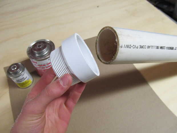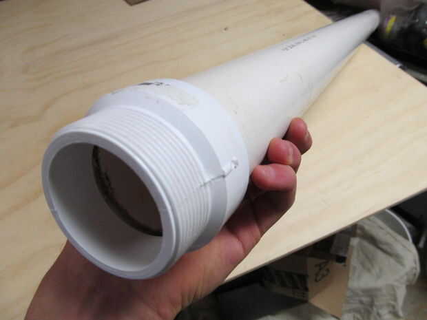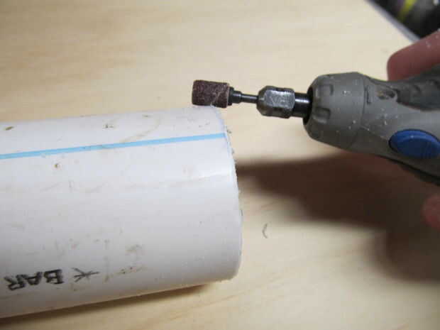 Por lo tanto, ahora tenemos que hacer el barril. No entraré en detalle en esta parte; Sabes lo que es. ¿Usted lo que? ¿De veras? Oh, está bien. El barril es lo que vamos a poner lo que queramos tirar en. Bolas de nieve, puntales, camisetas, lo que sea. ¿Estamos todos atrapados? Buena. Ahora, el cañón es la parte más simple del cañón, pero lo más importante también. Corte 4' pedazo de tubería de PVC de 2" de largo y salir la Dremel (u otra herramienta rotativa), ya que necesitamos hacer el cortador del bozal. El cortador del bozal es la sección del cañón que corta la patata exceso o bola de nieve como se carga en el cañón. Poner un poco de lija de la Dremel y configurarlo a la velocidad más baja para evitar quemar o derretir el plástico. Ahora, empezar a lijar alrededor del extremo del barril. Puede que deba recorrer el cañón varias veces para obtener el ángulo derecho, pero no te preocupes demasiado; como corta la patata no tiene que ser demasiado agudo. Quería subir el factor impresionante, así que usé la broca lija para cortar muescas en el cortador, que se verá casi como un cuchillo de sierra. Usé un poco de lija grueso, así que me fui sobre el cortador de toda boca con un pedazo de epílogos de lija regular. Es la boca del cañón, ahora solo tenemos que conectar el adaptador de roscado. Salir el imprimador y cemento y el adaptador en el otro extremo del tubo de cemento. Esto permitirá barriles intercambiables en el futuro (si quieres), pero sobre todo ayuda con montaje de cañón.
