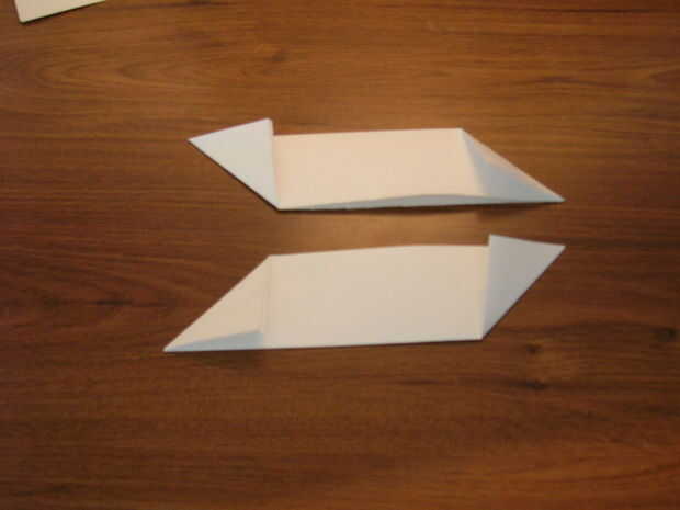 Doble la esquina superior derecha de la pieza superior y la esquina inferior izquierda de la pieza abajo hacia abajo. Luego, doblar esquina de arriba a la izquierda de la pieza superior y la esquina inferior derecha de la pieza fondo.