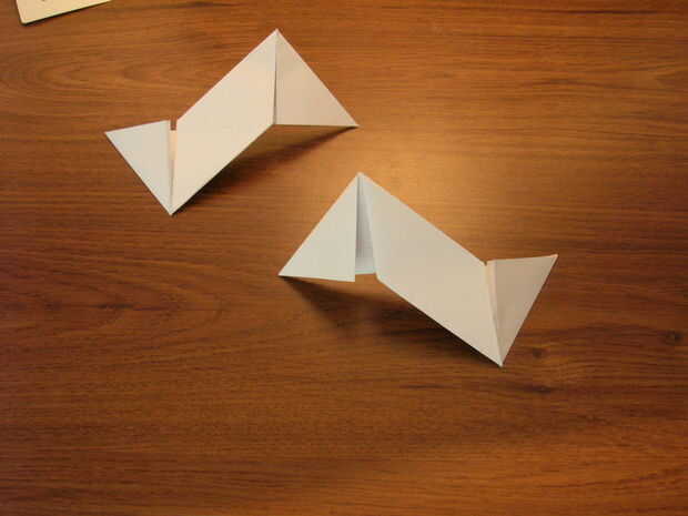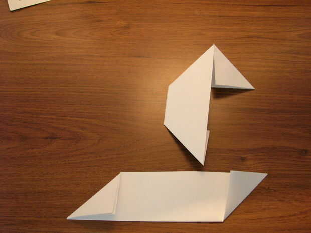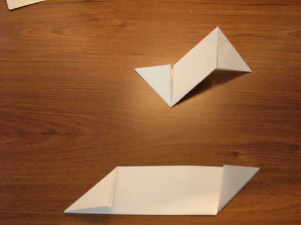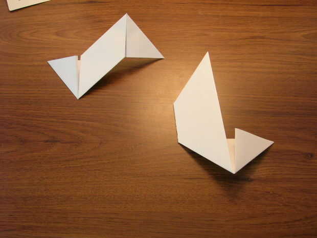 Por ahora, vamos a poner a un lado la pieza inferior. Punto de arriba a la izquierda de la pieza superior y dóblelo hacia abajo. A continuación, tome el que mismo punto y traerlo detrás a la izquierda. Para terminar la pieza inferior, hacer la misma cosa excepto espejada. Consulte las fotos aquí, ya que es difícil de entender en palabras.