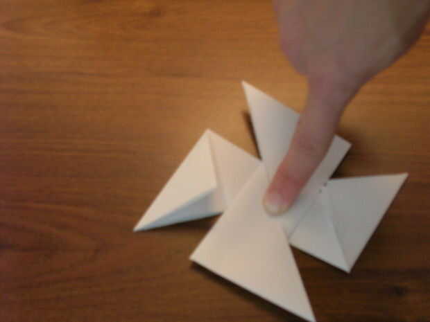 Voltee el producto semi-montado. Doble las puntas, pliegue y luego métalos dentro de las ranuras restantes.