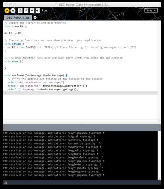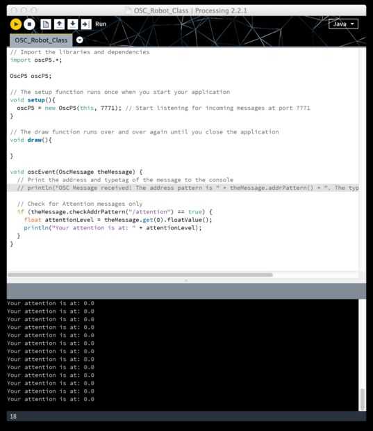 Impresionante. Ahora estamos recibiendo sólo los valores de atención e impresión de la pantalla. Necesitamos una manera de pasar esa información a otra función, por lo que podemos hacer algo con él. La manera fácil de hacerlo es con una variable global. Añadir la siguiente línea debajo de OscP5 oscp5;