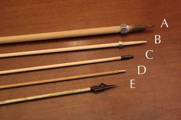 He hecho las flechas de diferentes longitudes, materiales y pesos. La flecha ideal tiene un centro de masa aproximadamente 1/3 de la parte delantera. Sin embargo, incluso sin un contrapeso muchas de estas flechas han volado > 100 yardas. Las distancias indicadas por las flechas de abajo es el promedio de 5 tiros. Las flechas con letras son las flechas por encima de las fotos.