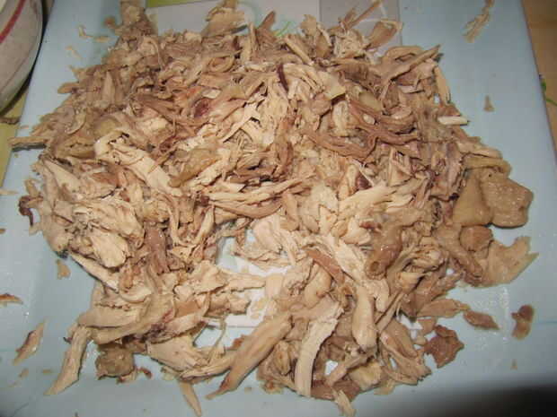 Retire el pollo de la sartén y cortar la carne en pedazos.