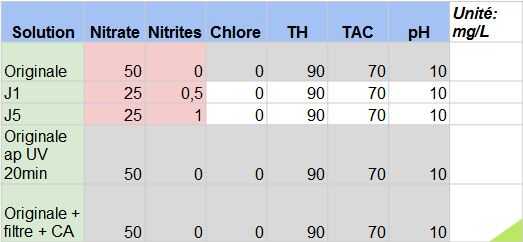 Usamos 2 válvulas de solenoide para controlar el flujo de agua. El carbón activa filtra todos los productos químicos, metales pesados y dan un color transparente al agua. La lámpara ultravioleta (357nm) es categoría C, es decir puede 'desintegrar' los microorganismos (bacterias...). Teóricamente deberíamos tener agua casi pura después de nuestro tratamiento. Hemos hecho algunas experiencias y pronto se dio cuenta de nuestras algas trabajado: bajó la concentración en nitratos como los nitritos subieron (nitritos son hechos por nitratos cuando algoritmos comen). Luego demostró que el carbón activado sería quitar todo el color (tuvo una copa de vino tinto, se convirtió en apenas rosado). De la UVC, utilizamos la tesis de Anis Ben Messaoud (http://eprint.insa-toulouse.fr/325/1/2009_Ben_Mess...