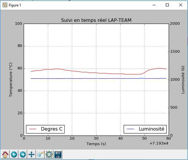 También decidí que va a ser cool tiene una función "en vivo" podría tener en un sitio web de algo, así que usar un pequeño programa en Python. Mira la foto 5 para hacerse una idea del resultado. También está subido en GitHub (https://github.com/AlexandreI4/LAP) bajo el nombre de "courbe.py". Es una beta por lo que no es perfecto. Necesitará unas cuantas bibliotecas como MatPlotLib numpy y drawnow. Encontrarás tutoriales en google para instalarlos, es bastante fácil. Tal vez voy a hacer un "paquete" más adelante, para simplificar la instalación.