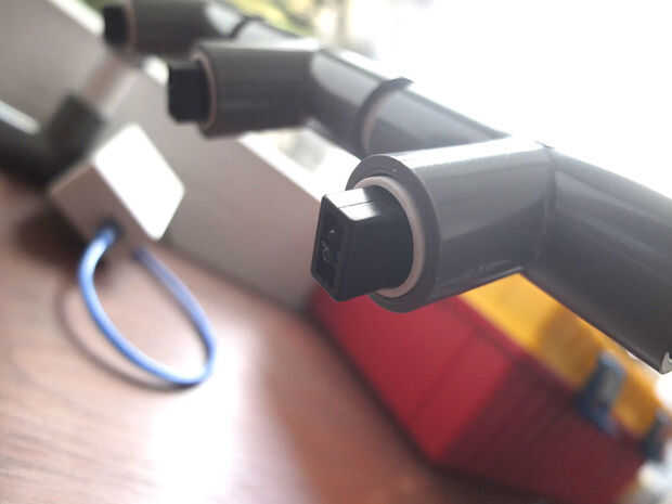 Utilizando tubería de PVC para cable de interior fácilmente, utilizando 1/2" de la tubería y corte largo como necesidad, que no usa pegamento justo clavija como jugar lego por lo que podemos girar / rotar el sensor de apoyo, ajuste hacia arriba y hacia abajo, izquierda y derecha, todo ajuste para asegurarse de que sensor es precisamente el centro en el circuito