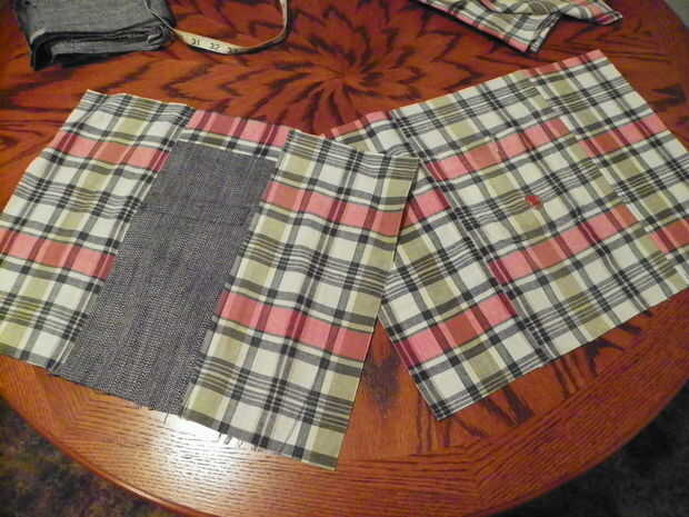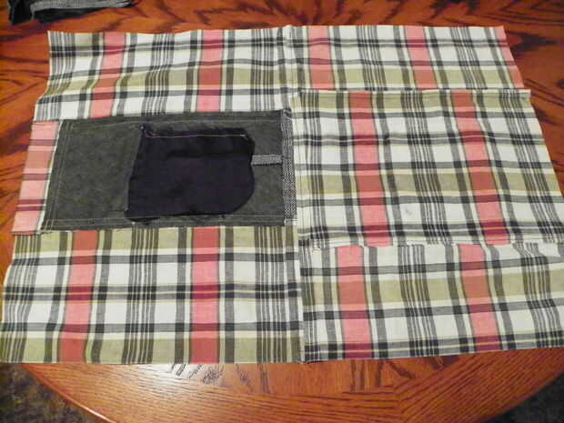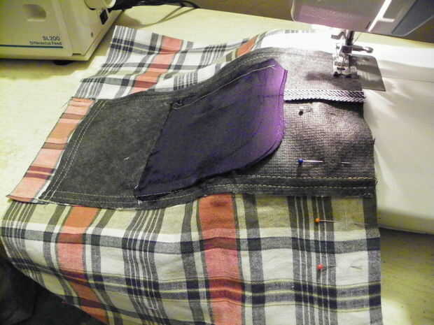 Las medidas finales para las piezas de revestimiento son 13-1/2" alto x 18" de ancho. Incorporar los bolsillos de la capa y la camisa, uno a cada lado del revestimiento. Esto le dará 2 bolsillos en el forro y 2 bolsillos exteriores para un total de 4 bolsillos. Pin el revestimiento piezas derecho lados juntos. Coser la parte inferior sólo con margen de costura de 1/2". Costura de prensa abierta. Ponga a un lado.