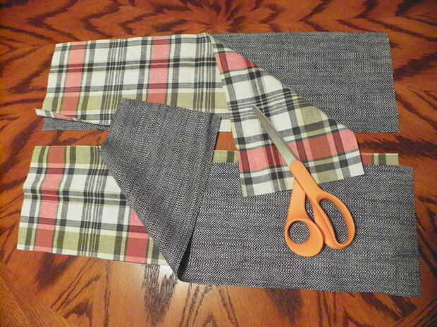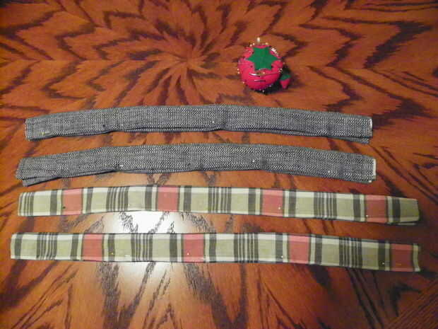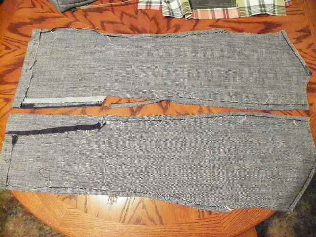 De la capa de nuevo las secciones, corte 2 piezas 6 "x 20". Guarde el resto de las secciones de espalda para las solapas de velcro. De la camisa, corte 2 piezas 6 "x 20". Prender cada rectángulo camisa capa rectángulo. coser alrededor de los 4 lados. Si la capa es un tweed de lana pesada, puede omitir este paso, esto es sólo para reforzar el mango. Doblar cada uno por la mitad longitudinalmente y presione. Abrir y plegar ambos bordes externos al centro y pulse. Doblar por la mitad otra vez y la clavija. Ponga a un lado. Corte 2 piezas de camisa 6 "x 22". Doblar cada uno de estos por la mitad longitudinalmente y doblar otra vez, pin. Meter 2" de una tira de la camisa en una tira del abrigo, prender. Repetir con otras tiras. Conecte los extremos y haciendo un círculo grande. La única parte de esta que se vea será las partes de la capa de la tira. Parte superior coser todo en ambos lados de la tira circular. Esto irá debajo de la lap-top, entre el exterior de la bolsa y el revestimiento, fabricación de asas muy seguros.