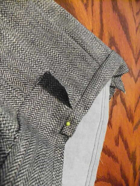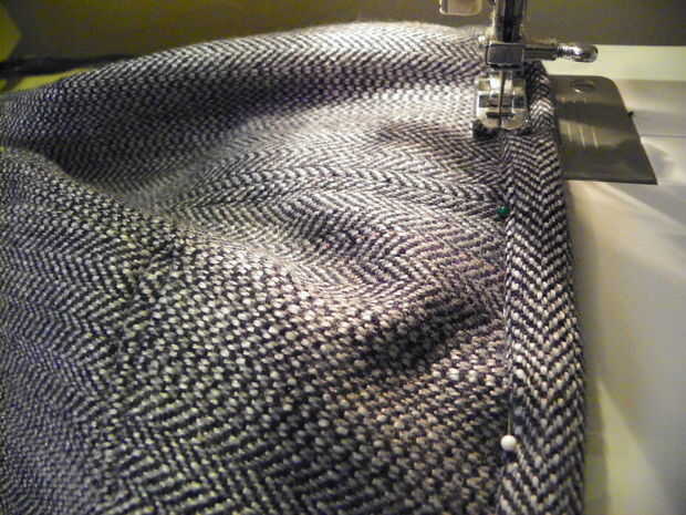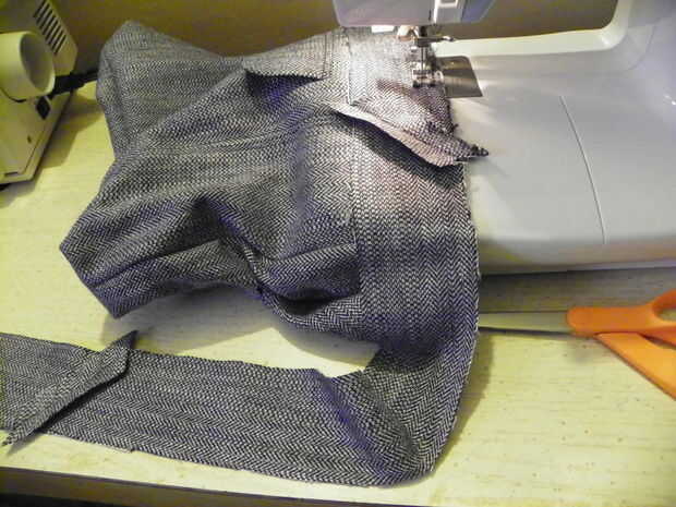 Cortar tiras de 2-1/2" de la capa, tendrá una longitud total de 38 o 40" de largo a recorrer todo el filo superior de la bolsa. Cosí 3 tiras para obtener suficiente para vincular el borde. Corte las puntas diagonalmente para que cuando se dobla sobre el interior no tengo el bulto en un solo lugar, ayuda a distribuir más uniformemente, haciendo un aspecto mejor acabado y evita que la aguja de coser de última hora. Pulse las costuras abiertas y luego lado derecho al lado derecho de la parte superior del bolso. Coser alrededor del borde superior con costura de 1/2". Doble enlace en el interior de la bolsa y el pin. Atascamiento alrededor de la puntada de la máquina.
