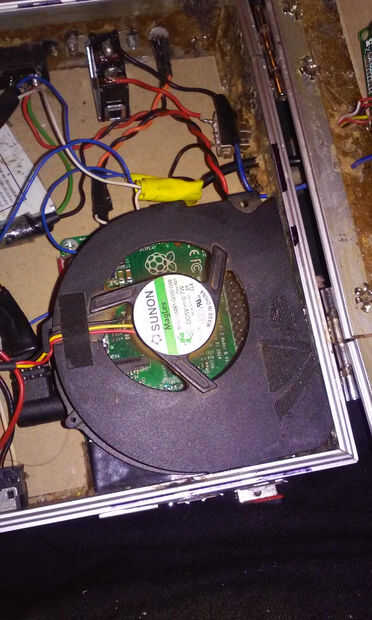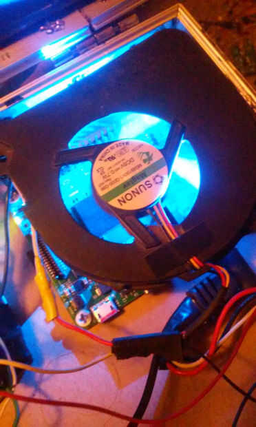 El Raspberry Pi es aproximadamente 29° c o 30° c al iniciar la GUI de escritorio y puede subir hasta 50° c, dependiendo de lo que está haciendo y se cierra alrededor de 80 ° c para proteger los componentes contra daño de sobrecalentamiento. Disipadores térmicos y ventiladores se utilizan para evitar el Pi se caliente demasiado. No tengo ningún disipadores de calor de tamaño adecuado pero tengo una gran cantidad de fans así que cavaron a través de mi colección y encontré este ventilador del ordenador portátil de un NV54 Gateway laptop que parecía ser el más perfecto ajuste. Se sienta cómodamente en la cima de los puertos USB y es el mismo ancho que el Pi y es prácticamente silencioso :D