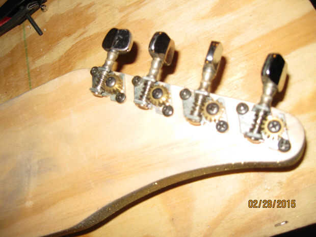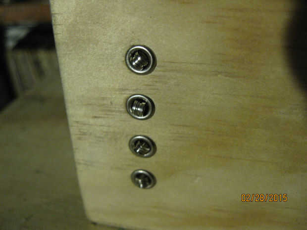 Empecé empujando arandelas de acero en las cimas y los fondos de los cuatro orificios en el extremo inferior del instrumento. Esto sostiene el extremo de la cadena en su lugar en la parte inferior y protege la madera de donde sale la cadena en la parte superior. Las cuerdas entró por la parte posterior, a través del puente y tuerca y los ejes del sintonizador. Había enchufado un sintonizador y que era que-él trabajó y sonaba muy bien!