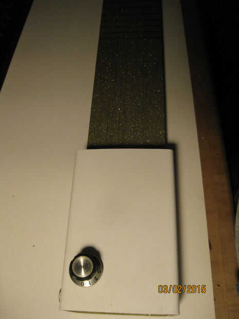 Después de colgadas y que funcionaba tomé las cuerdas flojas para marcar los 'trastes'. Estas son las marcas que me ayude a encontrar las posiciones de la nota. Puse un trozo de cinta azul a lo largo de la parte del cuello de la guitarra. Puesto que la base de dimensiones de la lap steel en el segundo traste de la guitarra, marqué cada traste a partir del segundo. He marcado en el traste 18.