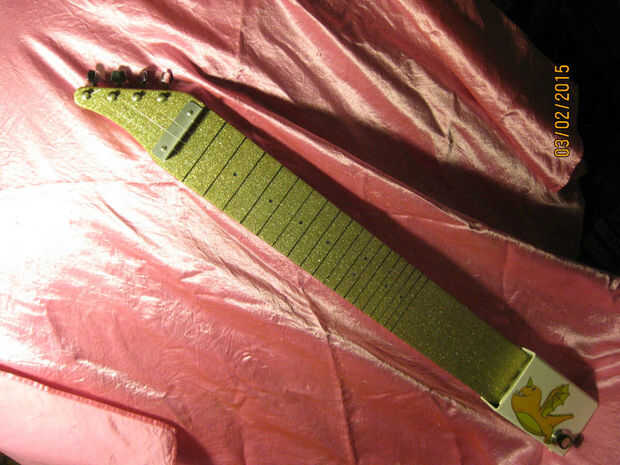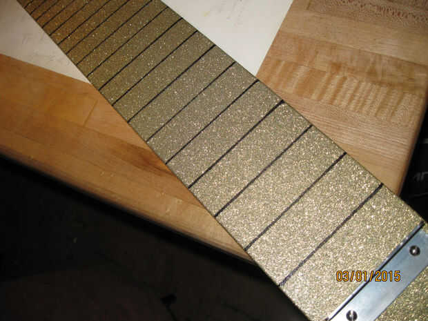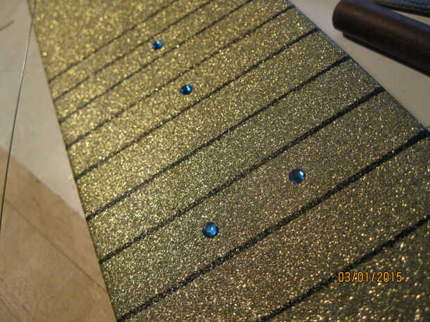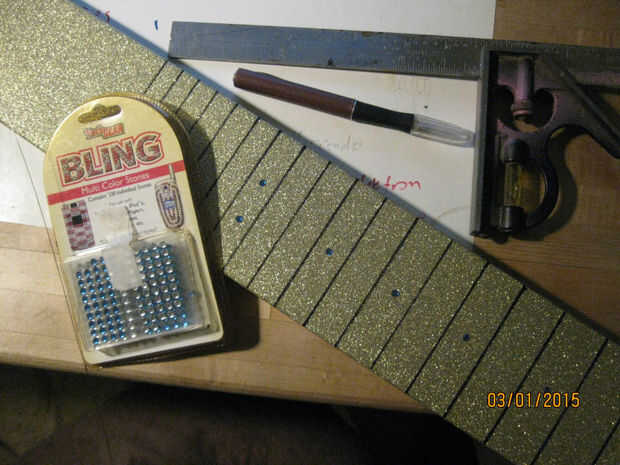 Con cuidado quita la cinta del cuello de la guitarra y ponerlo del lado de la marca vuelta acero, alineando el segundo traste en la cinta con el borde de la tuerca. Usé una escuadra de carpintero tri- y un lápiz de pintura para marcar todas las posiciones del traste. A continuación he añadido autas adhesivo joyas en los puntos de incrustación de fretboard para encontrar posiciones más fáciles de observar. Reemplacé las cuerdas y eso fue todo.