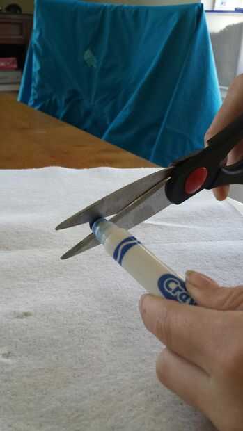 Con las tijeras, tire de la punta de fieltro por el cañón de la pluma. Asegúrese de que no cortar la punta. Póngala a un lado.