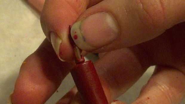 2. inmediatamente deje caer la gota de cera en el extremo afilado de la palanca de espaguetis. Girar el stick para distribuir uniformemente la cera. Debe ser una capa muy delgada.