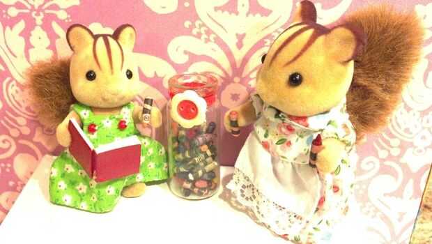 Aquí hay algunas fotos de mi mini lápices de colores. Acabo de poner todo de mi en un frasco pequeño. Un día, voy a hacer una caja de lápices de colores. Si lo hago, a añadir más fotos y las instrucciones aquí. También me gustaría crear un libro de colorear mini. Actualmente estoy creando una ardilla temática casa de muñecas/casita y estas ceras son para el dormitorio de los niños de una miniatura.